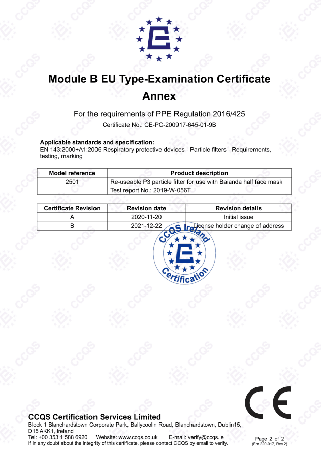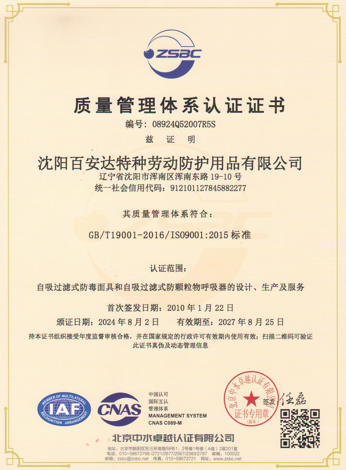 百安达精心制造,秉承“卓越品质、完美服务、持续改进、满足客户要求”的质量方针,已获得ISO9001:2015质量管理体系认证、获得中国LA、美国NIOSH(中国唯一)、欧盟CE、俄罗斯EAC的工厂及产品认证,产品获得几十项国家专利。百安达以高品质和高性能产品全面进入全球市场,成为全球化的公司之一。